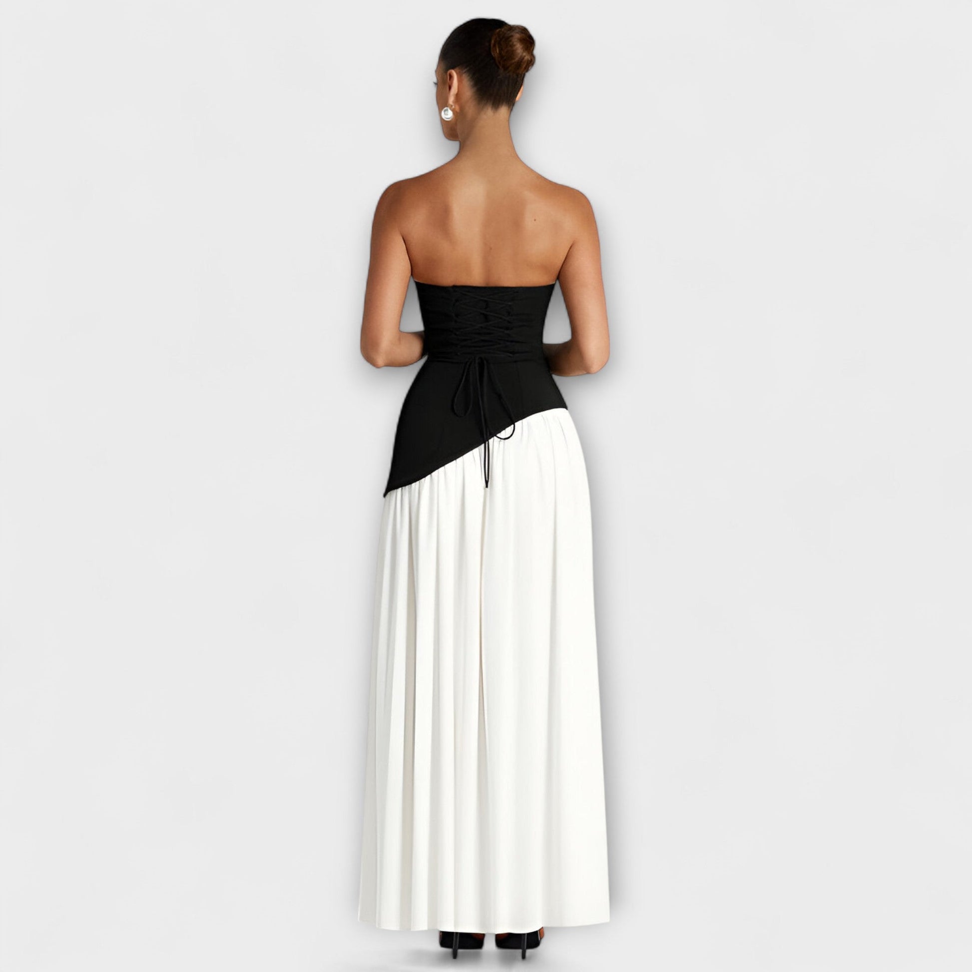 Kontrasterande Design: Den iögonfallande svarta strapless toppen kombinerat med en flödande vit kjol skapar en högmode-look som fångar uppmärksamhet och utstrålar sofistikering. Stick ut vid vilket evenemang som helst med denna fantastiska kombination.